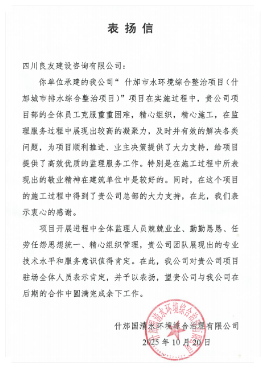 近日,我司榮幸收到什邡國(guó)清水環(huán)境綜合治理有限公司發(fā)來(lái)的書(shū)面表?yè)P(yáng)信,信中對(duì)由我司負(fù)責(zé)監(jiān)理的“什邡市水環(huán)境綜合整治項(xiàng)目”團(tuán)隊(duì)給予了高度評(píng)價(jià)與充分肯定。這封表?yè)P(yáng)信,不僅承載著業(yè)主單位對(duì)我們工作的認(rèn)可,更是對(duì)監(jiān)理人員始終堅(jiān)守“保質(zhì)量、抓安全、控進(jìn)度”職責(zé)初心的一次有力見(jiàn)證。